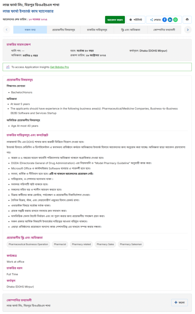 Lazz Pharma Job Circular 2025 নিয়োগ বিজ্ঞপ্তি অনুসারে আবেদন করা যাবে আগামী ১০ নভেম্বর ২০২৫ পর্যন্ত। আগ্রহী প্রার্থীরা দেরি না করে আবেদন কর
