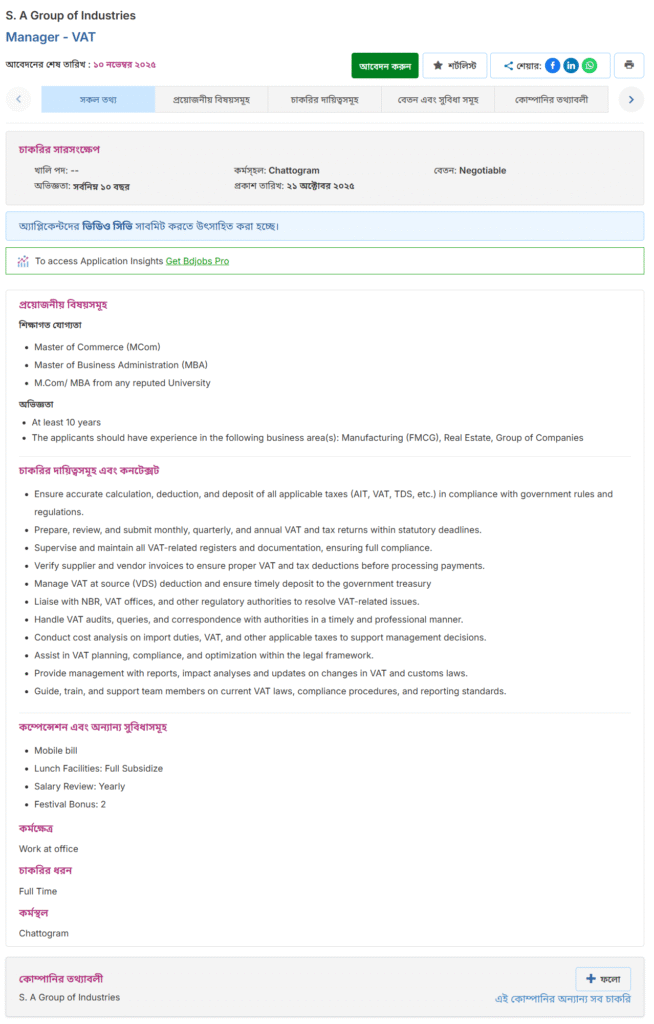 SA Group of Industries Job Circular 2025 বিজ্ঞপ্তিটি, বেসরকারি খাতে ক্যারিয়ার গড়ার জন্য একটি সুযোগ। বিশেষ করে VAT Management–এ অভিজ্ঞ, তাদের জন্য এটি একটি লোভনীয় পদ। যোগ্য প্রার্থীরা নির্ধারিত সময়ের মধ্যে আবেদন করে ক্যারিয়ারকে আরও এক ধাপ এগিয়ে নিতে পারে।